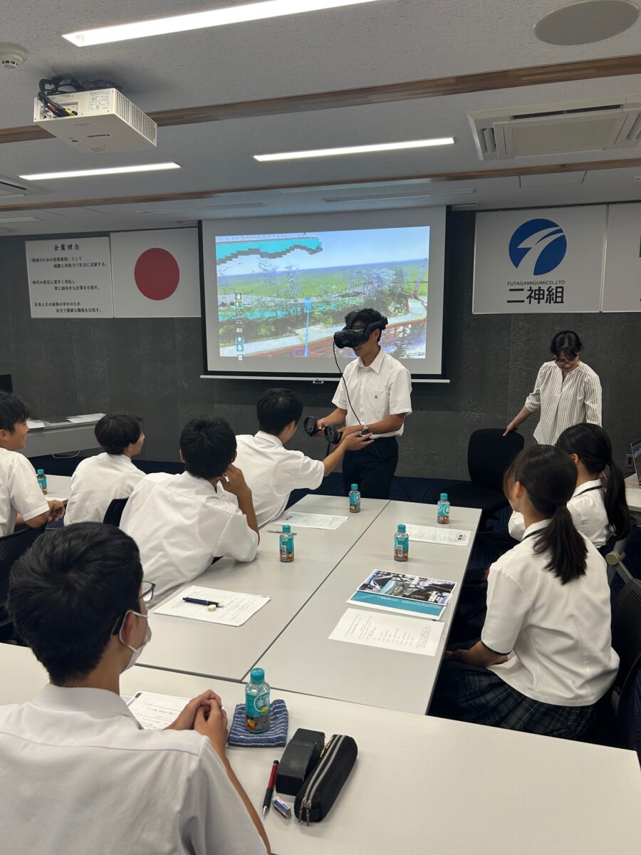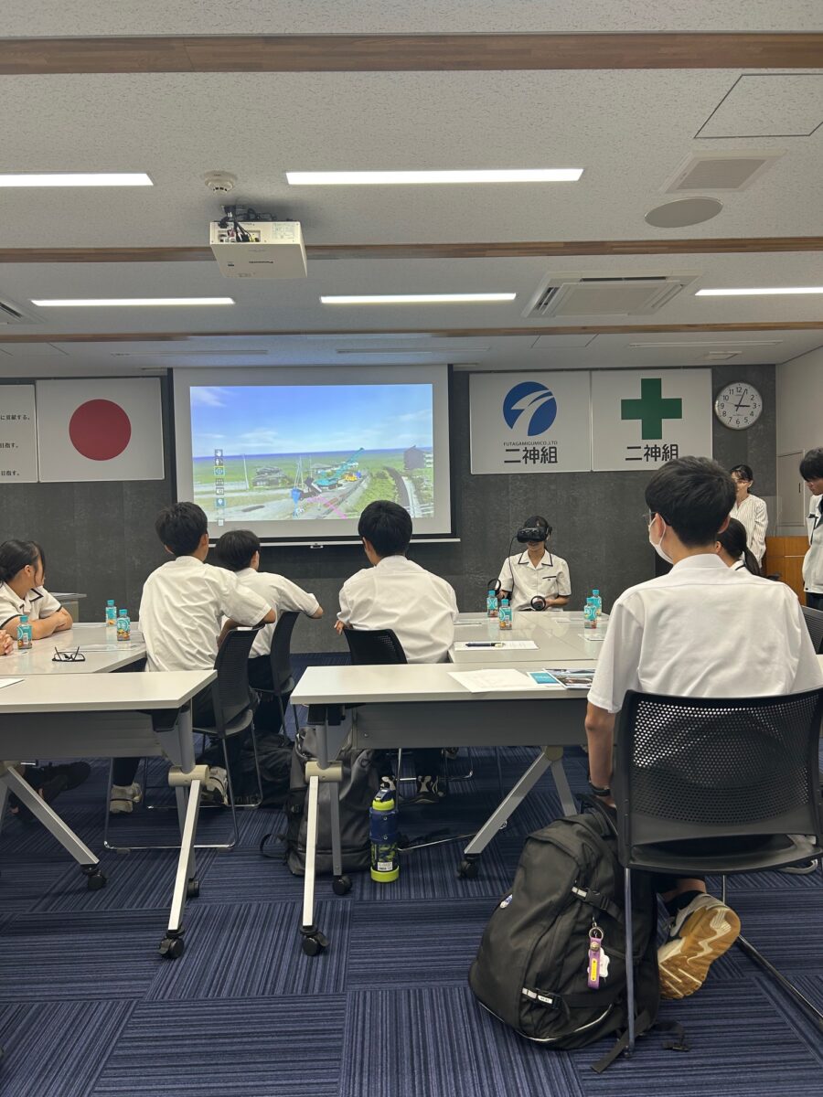 昨年より松山東高校生徒にもご参加頂いており、今回は趣向を変えて二神組が得意としている「ICT技術」について学んで頂きました!VRを活用し、全生徒にゲーム感覚で現場のイメージを体感して頂きました(#^^#)生徒の皆さんには非常に楽しんで頂いたようで、「ワー キャー」と声を出しながらVRを操作していたのが印象的でしたね! 生徒の皆さんありがとうございました!!