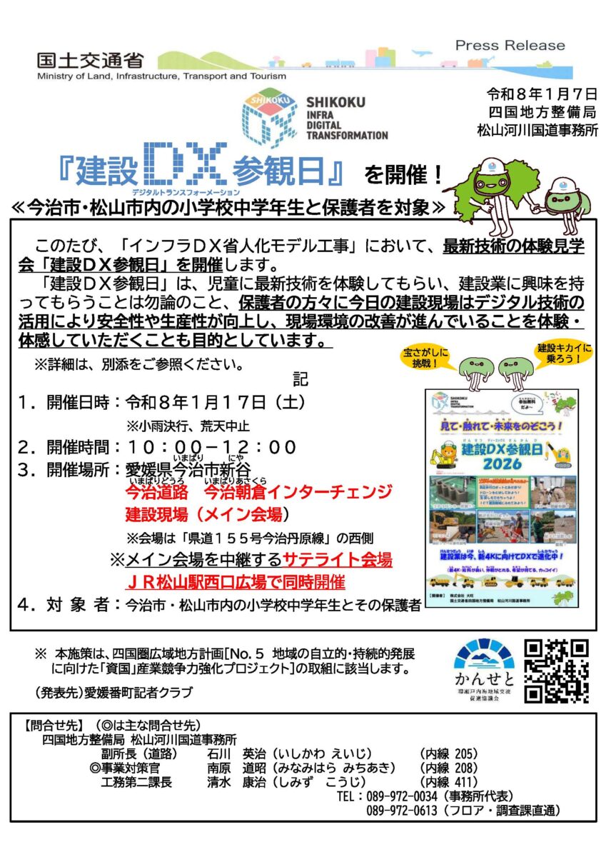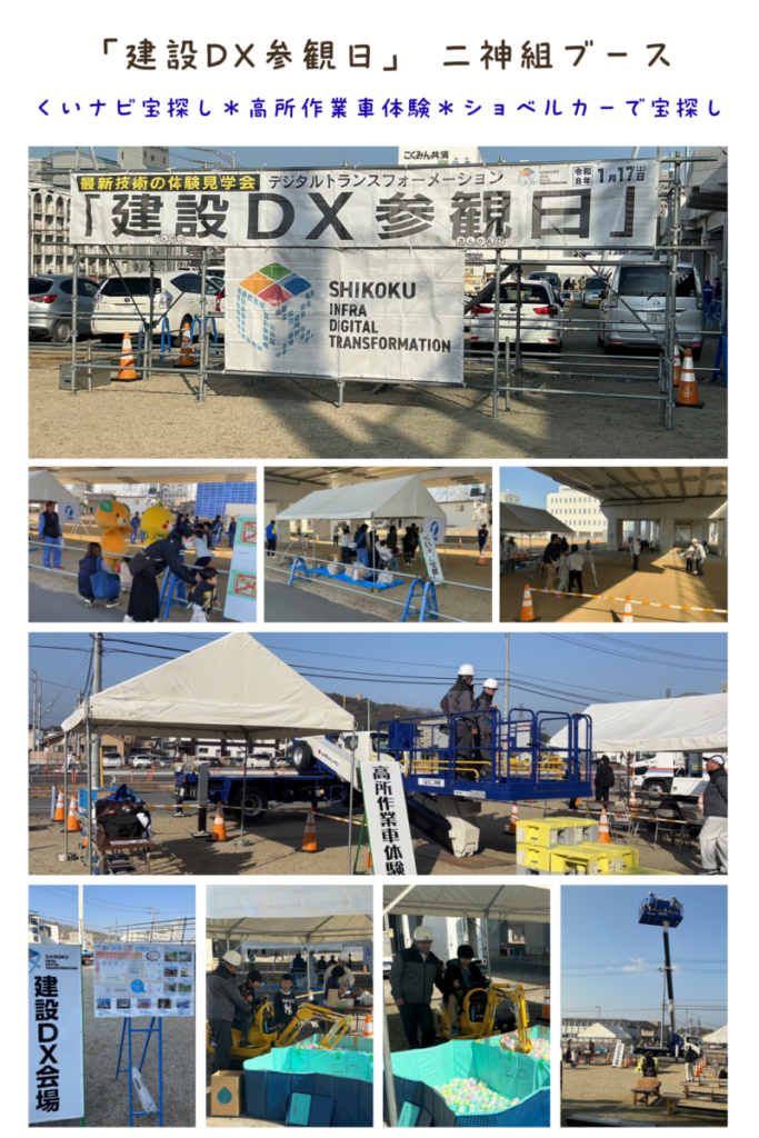 2026.01.17 「建設DX参観日」にブース出展! 国土交通省主催の「建設DX参観日」(サテライト会場:JR松山駅 西口広場)に3種類のブースを出展しました。 松山市の小中学生とその保護者の方を対象に、わかりやすく建設現場の魅力とデジタル技術の活用について体験してもらいました。 ◆くいナビ宝探し ◆高所作業車体験 ◆ショベルカーでボールすくい 各ブースとも好評で、スタッフも楽しく、忙しくそれぞれのブースで建設現場の魅力を伝えていました。 <前のニュース ニュース一覧 DATE 2026 2025 2024 2023 2022 2021 2020 2019 2018 2017 2016 2015 2014 2013 2011 2010 2009 2008 2009 2004